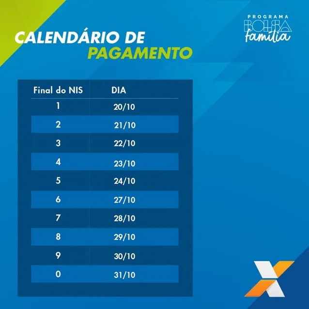 Os pagamentos são realizados de acordo com o final do NIS do beneficiário e seguem o calendário de pagamento do Programa Bolsa Família.