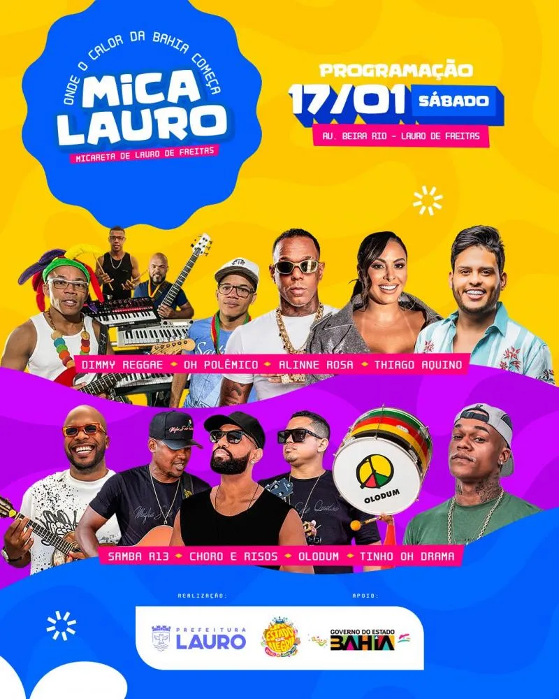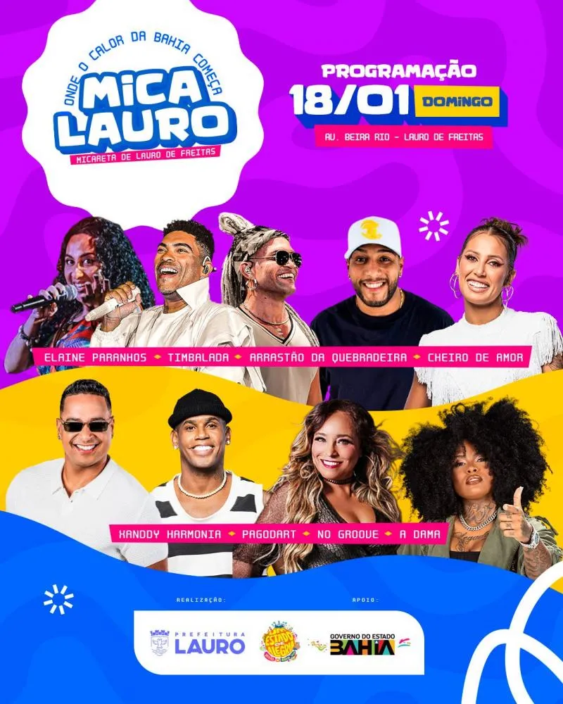 Com a aproximação da Mica Lauro, a cidade se transforma para receber milhares de foliões entre os dias 16, 17 e 18 de janeiro. O evento vai levar muita música e alegria para quem for ao circuito da festa, que contará com atrações como Parangolé, Tony Sales, Olodum, Thiago Aquino, Xanddy Harmonia, Timbalada, entre outras.
